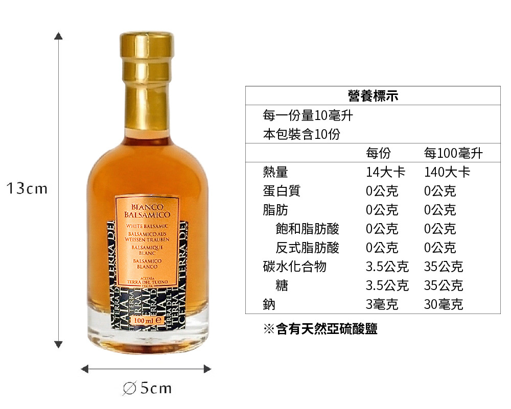 品名:雷霆之地白巴薩米克醋 (調理) 成份:經濃縮白葡萄,白葡萄酒醋 內容:100ml 重量:295g 原產地:義大利 食品業者登錄字號:B-124597633-00000-8 國際商品條碼:8032979001995 投保產品責任險字號: 0500字第26AML0000370號 本產品已投保產品責任險新台幣一千萬元 ※註「投保金額不等同理賠金額」