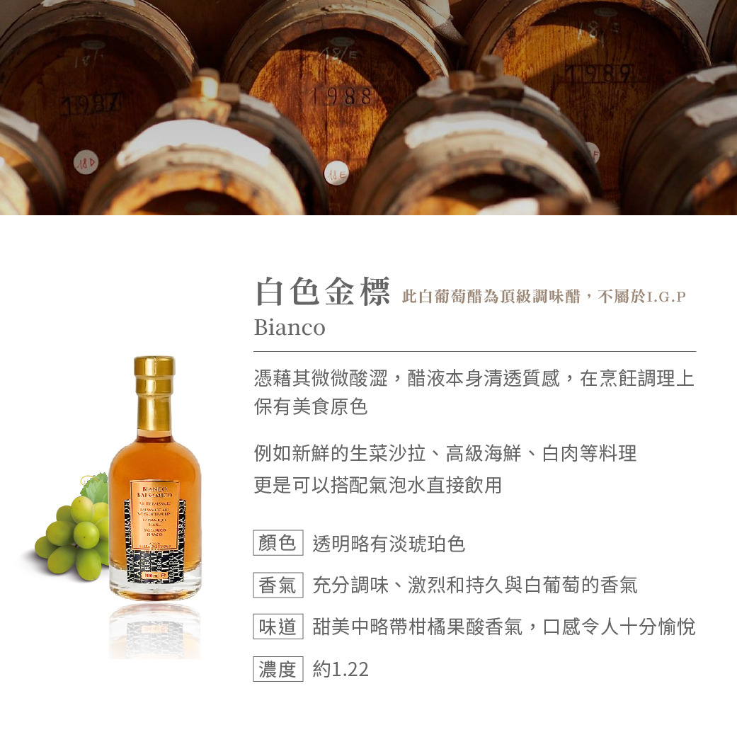 ➤義大利摩德納百年醋廠 ➤遵循家族古老傳統配方 ➤整顆葡萄帶皮熬煮木桶釀造 ➤100%天然,不添加焦糖色素、增稠劑、防腐劑 ➤選用Spergola和Trebbiano品種葡萄 ➤持久的白葡萄香氣中帶柑橘果酸 ➤推薦搭配生菜沙拉,或搭配氣泡水飲用 ➤有效日期 2028/12/31